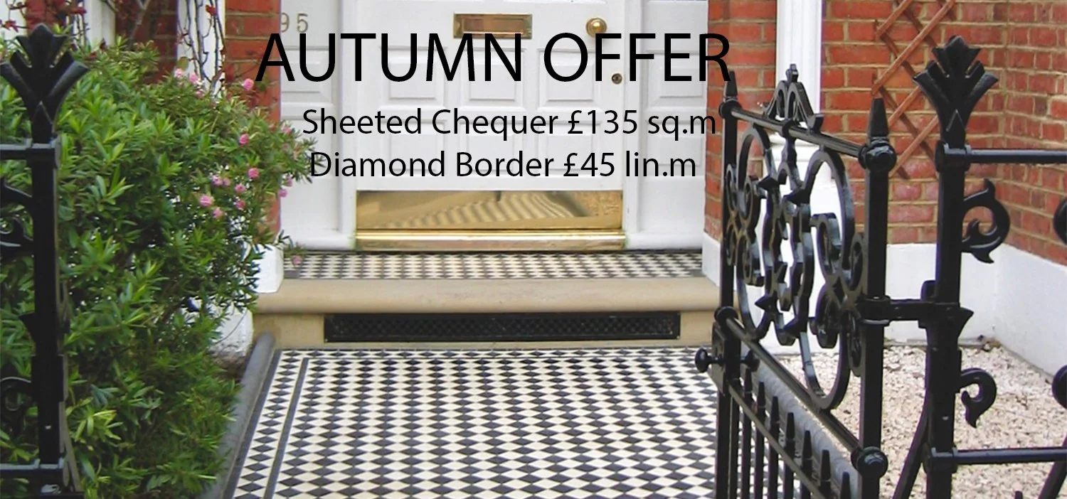 Easy to lay Victorian mosaic patterns by post. Black and White Victorian Mosaics. Chequerboard Tiles. Black and White Chequer. Original Victorian Mosaic Designs. Blue and White Chequer. Black and white hallways. Black and white paths. Black and white pathways. Victorian path tiles. Floor tiles. Victorian chequer tiles. Chessboard tiles. Victorian chessboard tiles. Original chequerboard tiles. Advice on design and colour. Tiles made in France and patterns built in our British workshop.