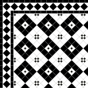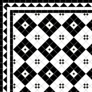 Easy to lay Victorian mosaic patterns by post. Black and White Victorian Mosaics. Chequerboard Tiles. Black and White Chequer. Original Victorian Mosaic Designs. Blue and White Chequer. Black and white hallways. Black and white paths. Black and white pathways. Victorian path tiles. Floor tiles. Victorian chequer tiles. Chessboard tiles. Victorian chessboard tiles. Original chequerboard tiles. Advice on design and colour. Tiles made in France and patterns built in our British workshop.