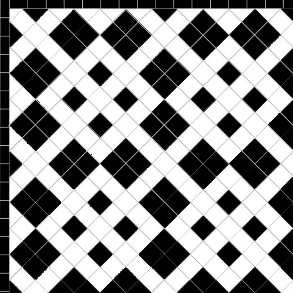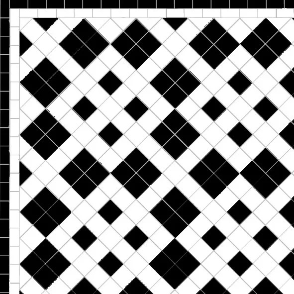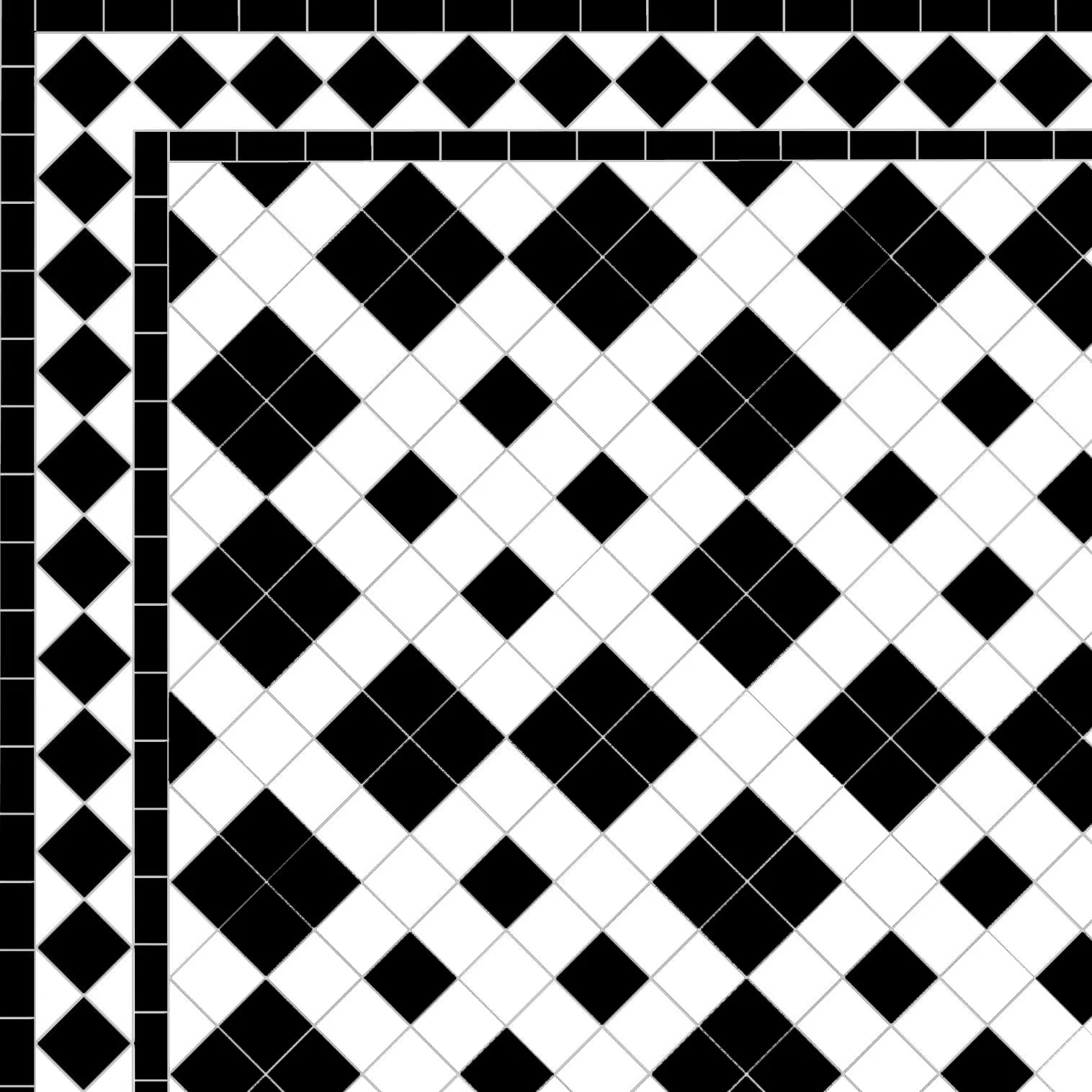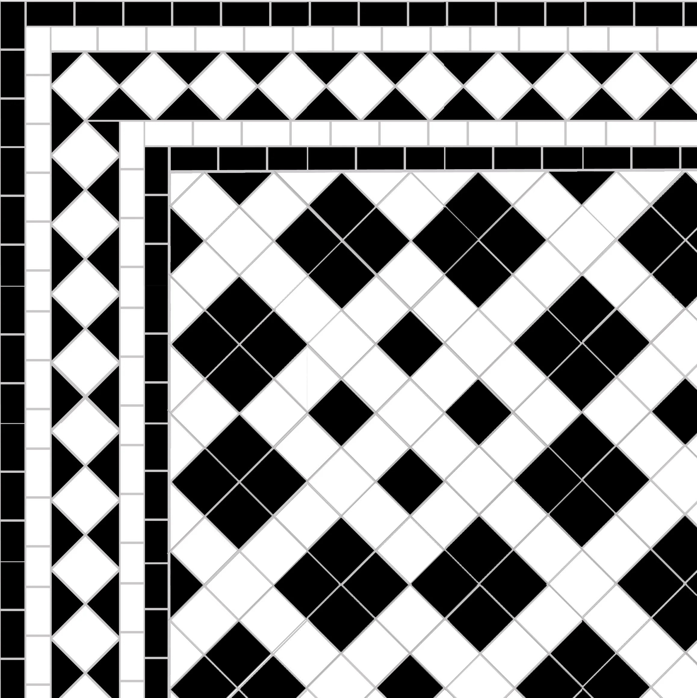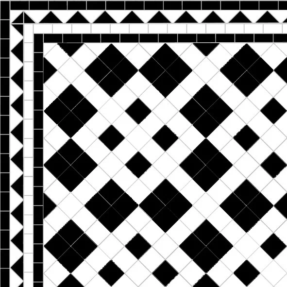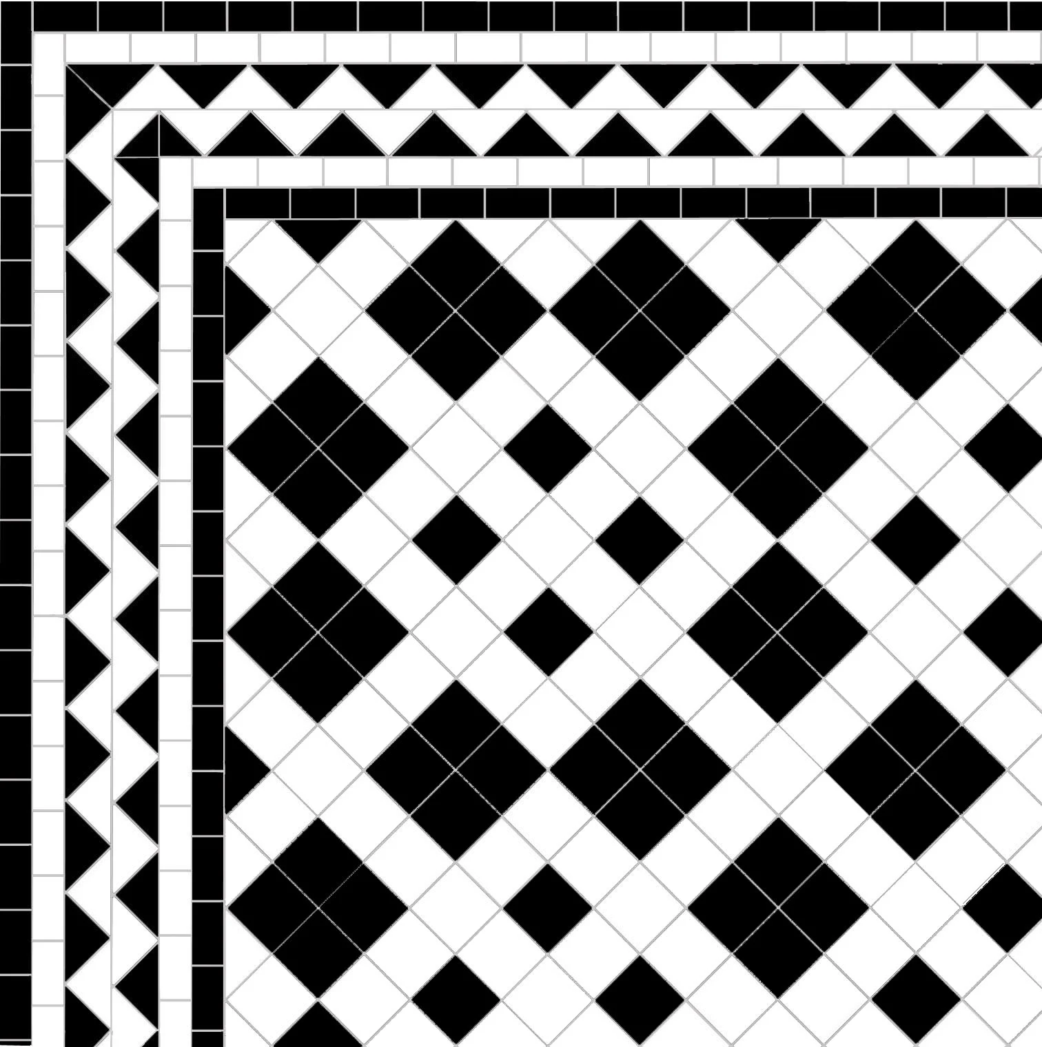 Easy to lay Victorian mosaic patterns by post. Black and White Victorian Mosaics. Chequerboard Tiles. Black and White Chequer. Original Victorian Mosaic Designs. Blue and White Chequer. Black and white hallways. Black and white paths. Black and white pathways. Victorian path tiles. Floor tiles. Victorian chequer tiles. Chessboard tiles. Victorian chessboard tiles. Original chequerboard tiles. Advice on design and colour. Tiles made in France and patterns built in our British workshop.